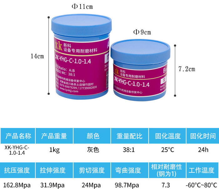 1.先預(yù)熱已噴砂的設(shè)備,再將XK-YHL-1.0高分子耐磨顆粒膠按比例混合攪拌均勻,用批刀或塑料刮板對磨損部位進行修復(fù);
